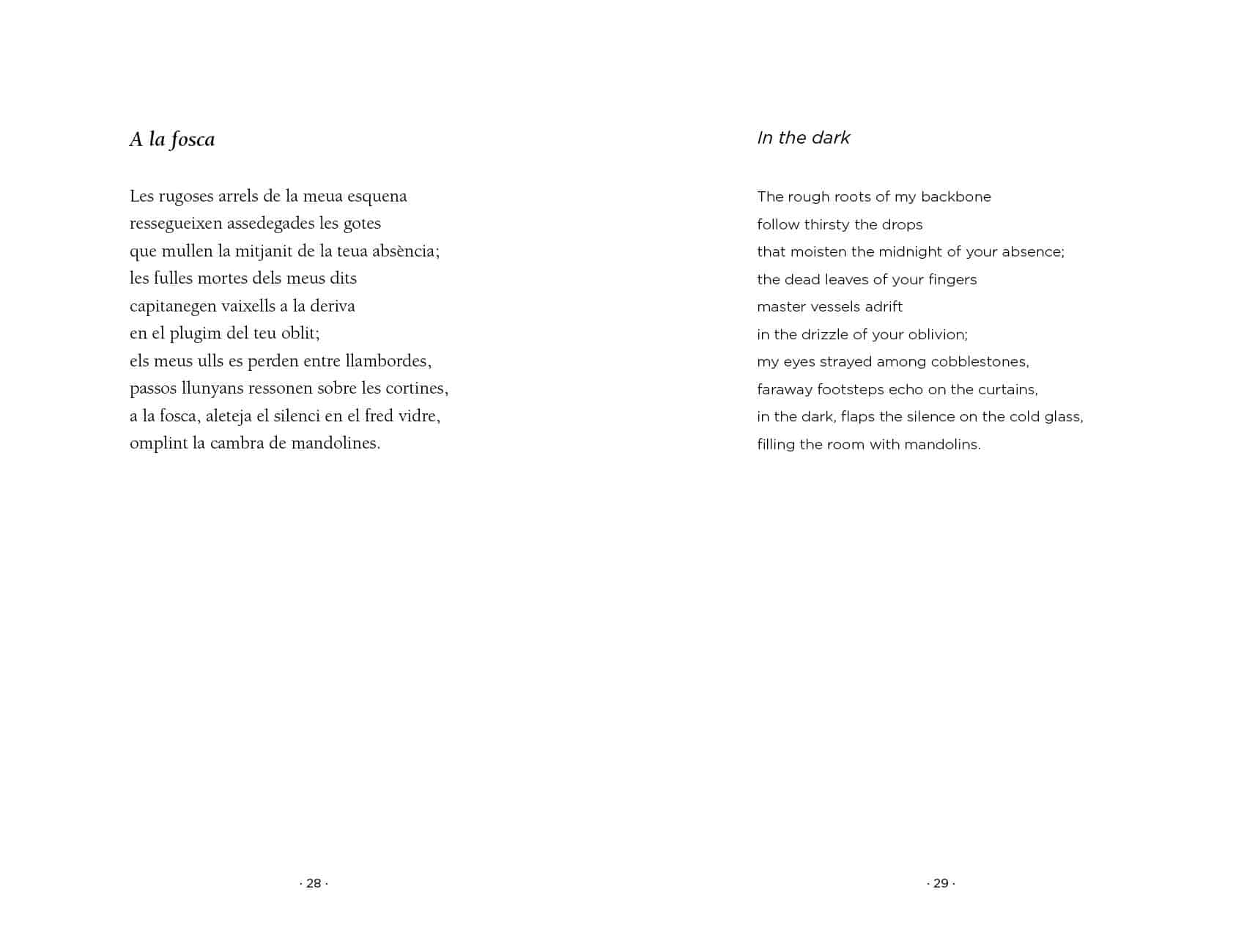 Her poetry is a mirror of her own personality, intense, powerful, full of imagery,loving. All feelings fit in Alé de Lluna, in poems endowed with great sensibility, which heightens the body sensations, the most intimate desires, while we find vindicating verses that bind us to our condition of humans.